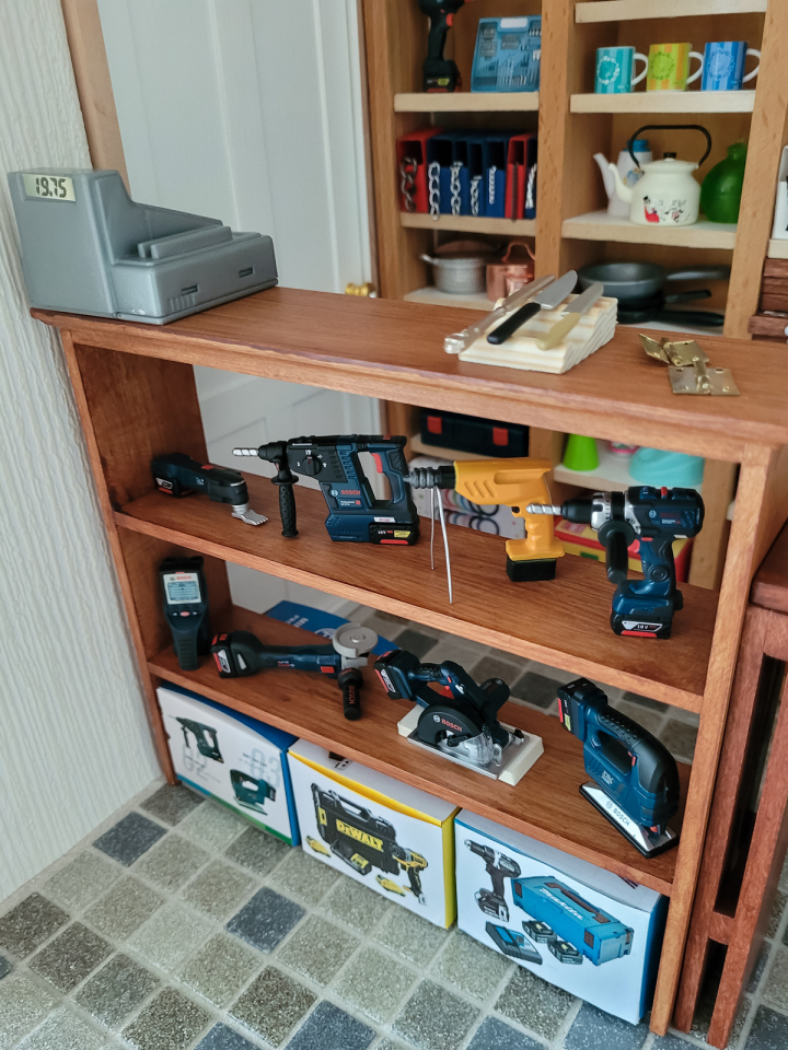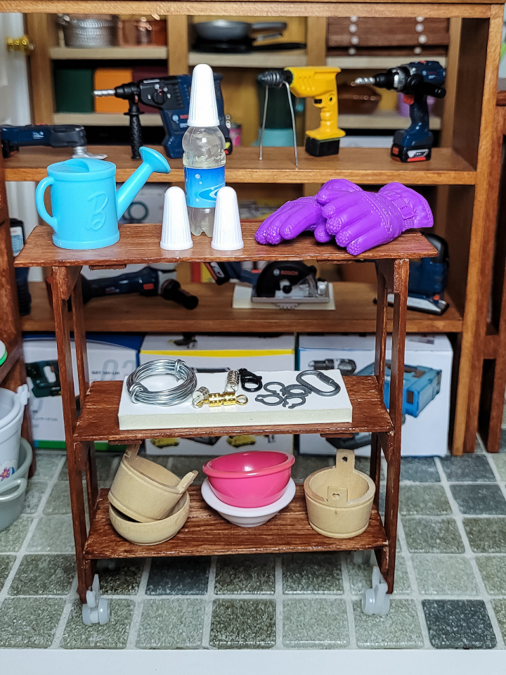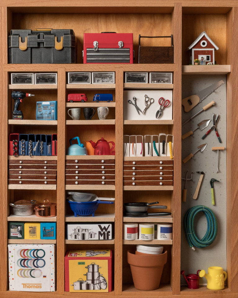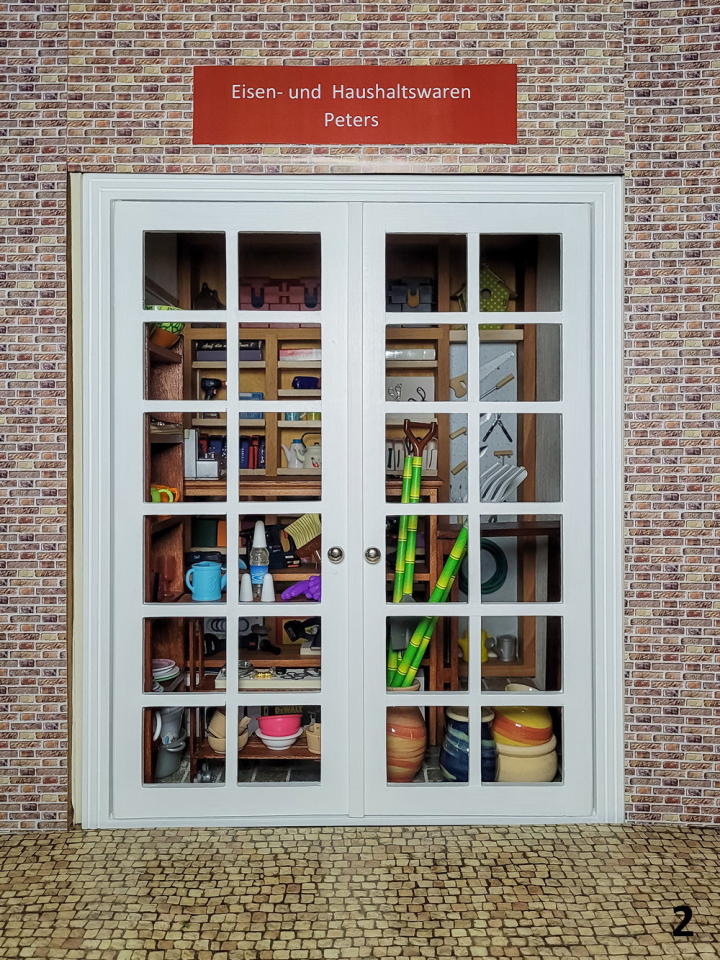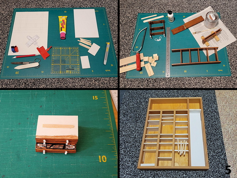 Ein Besteckkasten wird zu einem Regal umfunktioniert, einRollwagen, ein Regal, eine klappbare Absperrung und Schubladenelemente werden gebastelt. Dazu kommen auch kleine Kartons für die Meterware u.v.m.