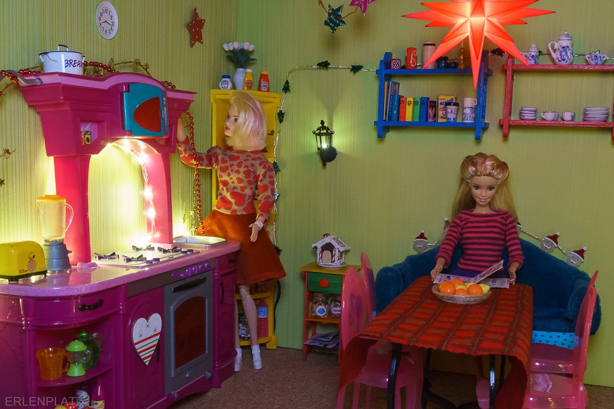 Die Wohnküche wurde von Emma weihnachtlich geschmückt. Sie hätte gerne die Küche komplett mit blinkender, leuchtender,