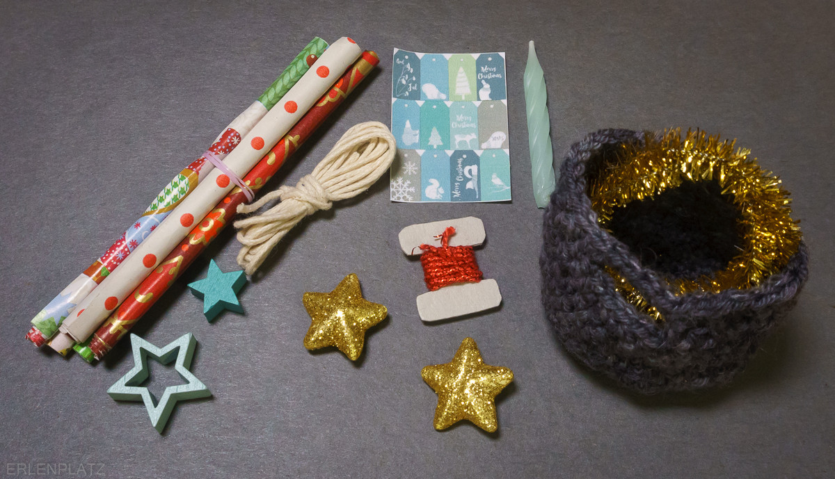 Das hübsche weihnachtliche Geschenkpapier, die niedlichen weihnachtlichen Geschenke-Anhänger, das rotglitzerne Band und das Paketband kommen ihr gerade richtig gelegen. Wenn sie morgen Geschenke einkaufen geht, hat sie für das Verpacken schon alles bereit.