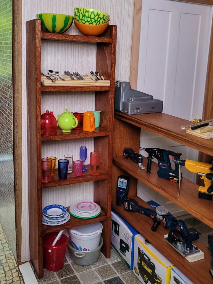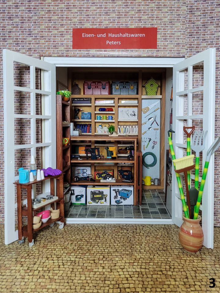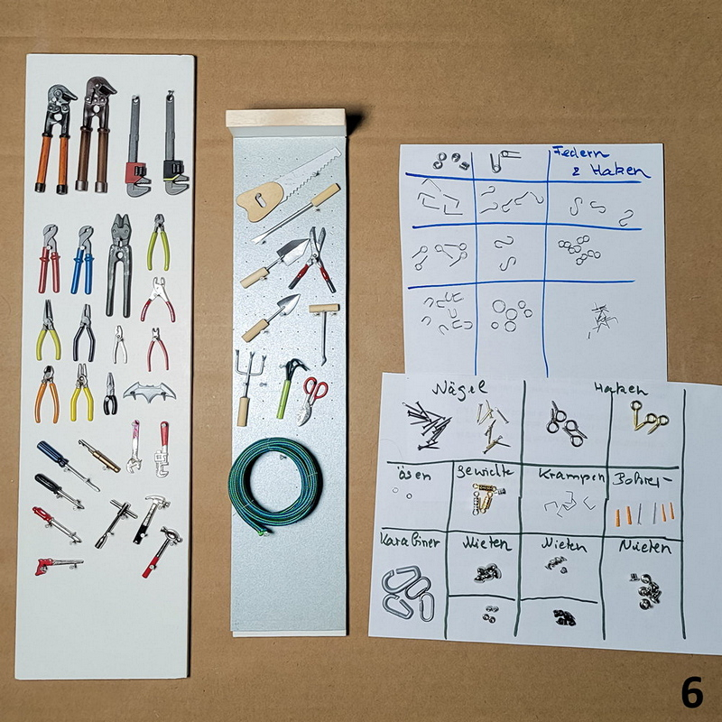 Ein Besteckkasten wird zu einem Regal umfunktioniert, einRollwagen, ein Regal, eine klappbare Absperrung und Schubladenelemente werden gebastelt. Dazu kommen auch kleine Kartons für die Meterware u.v.m.